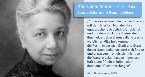 Alice Bensheimer war über drei Jahrzehnte hinweg in der Mannheimer, badischen und reichsweiten bürgerlichen Frauenbewegung aktiv. Die langjährige Schriftführerin des Bundes Deutscher Frauenvereine (BDF) und journalistisch tätige Frauenrechtlerin kooperierte mit dem staatsnahen Badischen Frauenverein genauso wie mit der im Kaiserreich misstrauisch betrachteten sozialdemokratischen Frauenbewegung. Sie war überzeugt davon, dass Fraueninteressen den politischen Lagern überzuordnen seien. Weibliches Engagement in sozialen Belangen verstand sie als Schule und Wegbereiter für das Frauenstimmrecht.