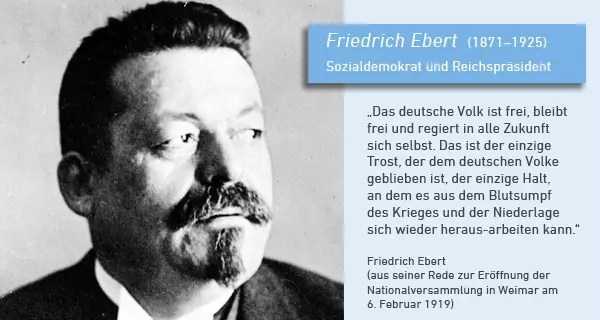 Friedrich Ebert wurde am 4. Februar 1871 in Heidelberg geboren. Er begann eine Lehre als Sattler, trat noch während der anschließenden Wanderschaft der späteren SPD bei und war als politischer Redner und Organisator aktiv. Während seiner Zeit in Bremen bewies er als Arbeitersekretär der lokalen SPD ein offenes Ohr für die konkreten Probleme der „einfachen Leute“. Zeit seines Lebens konzentrierte er sich auch vor dem Hintergrund dieser Erfahrungen eher auf die kurzfristige Lösung akuter Missstände als auf das langwierige Ausfechten programmatischer Auseinandersetzungen. Einem raschen Aufstieg zum überregional bekannten Arbeiterführer und Mitvorsitzenden der SPD folgte 1912 der Einzug in den Reichstag.